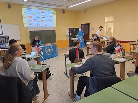 Am 6.11. hat der Politikkurs der QP2 pw618 im Rahmen des Semesterthemas "Friedens- und Sicherheitspolitik, Prozesse auf globaler Ebene" im Konfliktplanspiel, das Jugendoffizier Fabian Gruhn gestaltete, simuliert. Ziel war es, jeweils aus Sicht eines Staates, möglichst die eigenen Interessen bi- oder multilateral durchzusetzen, und dennoch zu einer globalen Friedenslösung im UN-Sicherheitsrat zu gelangen. Dazu positionierten sich die Staats- und Regierungschefs zunächst jeweils mit einer Rede im Rahmen der UN-Generalversammlung, in der sie ihren Positionen und Forderungen Ausdruck verliehen. In einer zweiten Phase mussten dann Kompromisse und Verträge ausgehandelt werden, es wurden folgend zwei Resolutionen im Sicherheitsrat verabschiedet. Diese Ergebnisse wurden anschließend auf einer Karte veranschaulicht und reflektiert.