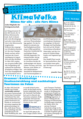 Traditionell direkt nach den Herbstferien findet an unserer Schule wieder die jährliche Klima-Aktionswoche im Rahmen des schulinternen BNE-Kinzepts (Bildung für Nachhaltige Entwicklung) statt. Auch 2025 ist es das Ziel, dass die Themen Klimaschutz und Nachhaltigkeit möglichst an keinem Mitglied der Schulgemeinschaft vorbeigehen. Im Unterricht wird für verschiedene Aspekte in diesem Kontext sensibilisiert, über fachspezifische oder fächerübergreifende Themen in diesem Zusammenhang informiert und diskutiert. Ebenfalls inzwischen eine Tradition ist die begleitende digitale Broschüre "KlimaWolke", in der alle Aktivitäten dargestellt werden. Darüber hinaus bietet sie auch immer einen Einblick in weitere BNE-Themen aus dem Schulalltag, in diesem Jahr zum Neubau des Hauptgebäudes, der Schulhofplanung und unseren internationalen Erasmus+-Projekten. Die KlimaWolke 2025 gibt es hier zum Download. Wir freuen uns in diesem Jahr über ein besonderes Angebot des Seminarfachkurses "Nachhaltigkeit" der QP1 von Herrn Stolle, der für verschiedene Altersgruppen Unterrichtsstunden vorbereitet hat und diese mit unterschiedlichen Lerngruppen in der Klima-Aktionswoche durchführen wird. Vielen Dank für dieses tolle Angebot! Im Rahmen der Klima-Aktionswoche wird es auch eine Preisübergabe für die erfolgreiche Teilnahme am VCD-Fahrradwettbewerb geben. Die Informationen zur Klima-Aktionswoche sind schulintern per Itslearning verfügbar und per Mail an alle Eltern und Erziehungsberechtigten verschickt worden. Wir freuen uns, wenn diese Woche zum Anlass genommen wird, auch in den Familien wieder über indviduelle Beiträge zum Klimaschutz nachzudenken und diese umzusetzen, z. B. ein umweltfreundlich zurückgelegter Schulweg, das umweltfreundlich verpackte Pausenbrot oder auch Möglichkeiten des Energiesparens.