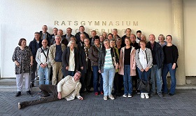 Am 30.09. besuchte der Abiturjahrgang von 1979 unsere Schule und besichtigte neben den bekannten Gebäudeteilen Pausenhalle, Trakt B und Aula auch Trakt S und ließ sich am Modell für das neue Hauptgebäude und den Schulhof die schon sichtbaren, aber noch fertig zu stellenden Teile des Schulgeländes erläutern. Während beim letzten Besuch 2019 noch ein Gruppenbild auf der Treppe des alten Haupteingangs unter dem Schriftzug möglich war, wurde nun der vorübergehende Haupteingang an der Rathaustraße für das Foto genutzt. Wir freuen uns aber darauf, bei der für in vier Jahren geplanten erneuten Führung den historischen Schriftzug am neuen Hauptgebäude wieder für ein Bild nutzen zu können. Im Rahmen der Schulführung spendete der Abiturjahrgang 300,- Euro an den Verein der Freunde und Förderer des Ratsgymnasiums - wir bedanken uns für diese finanzielle Unterstützung unserer täglichen Arbeit und freuen uns, dass auf diesem Weg wieder einmal der Besuch einer Ehemaligengruppe der aktuellen Schulgemeinschaft zugute kommt!